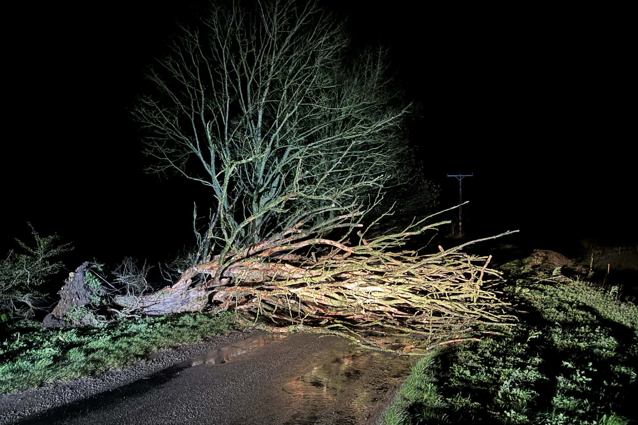 • A 60ft tree blocking a B road, requiring urgent cutting and removal